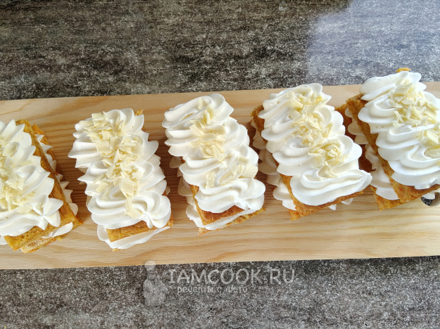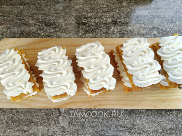 Можно сделать 10 пирожных одинарных или же 5 двойных, для этого сверху накрыть вторым коржиком и снова отсадить крем.