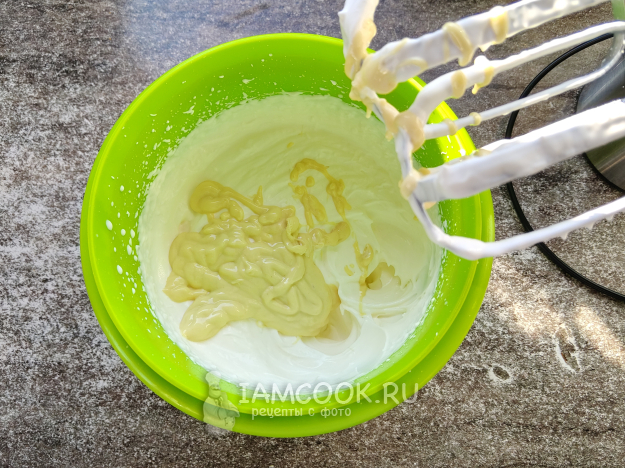Холодные сливки взбить с сахаром на высоких оборотах миксера до стойкого крема.