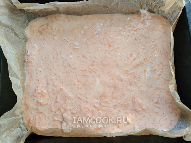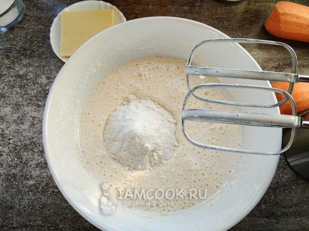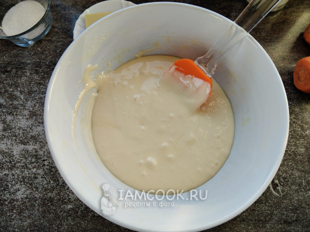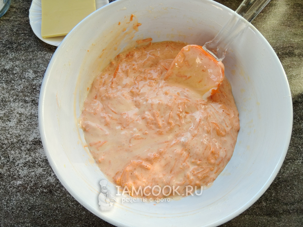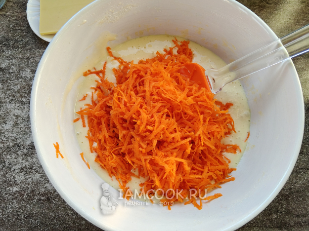 Натереть на мелкой терке морковь, отжать, добавить овощ в тесто.