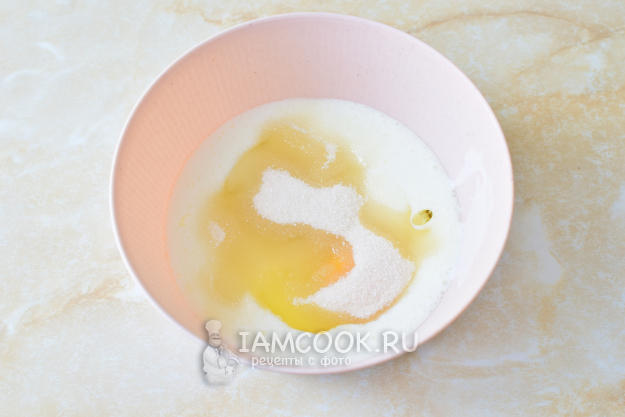 Влейте растительное масло. Добавьте сахар и щепотку соли. Смешайте.