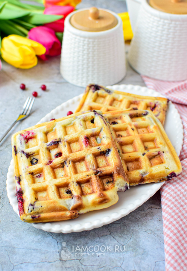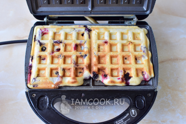 Готовьте вафли с ягодами по 4-6 минут. Ориентируйтесь по своей технике. Готовые вафли станут золотистого цвета. Снимите их с вафельницы.