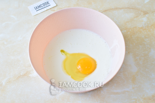 Для теста налейте в чашу кефир и добавьте яйцо.