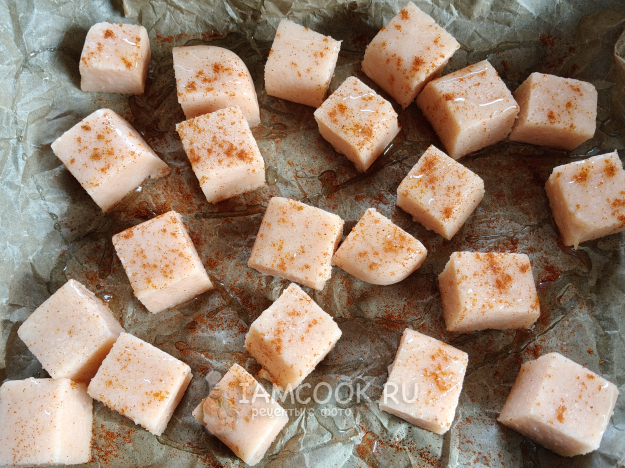 Переложить на противень с пергаментом, сбрызнуть маслом, посыпать специями (я взяла паприку и красный перец).