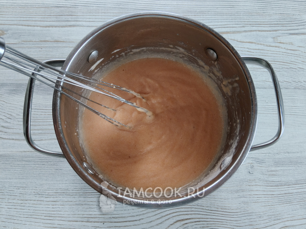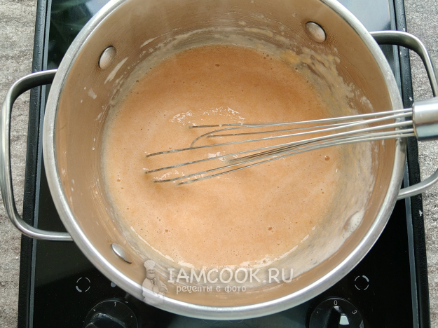 Перелить в кастрюлю, добавить 150 мл теплой воды.