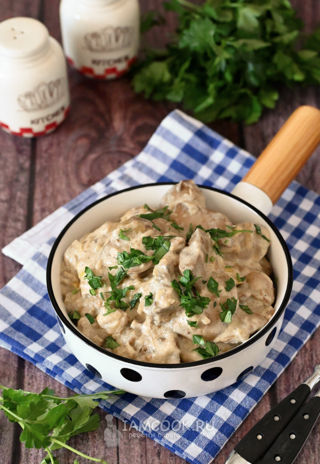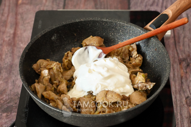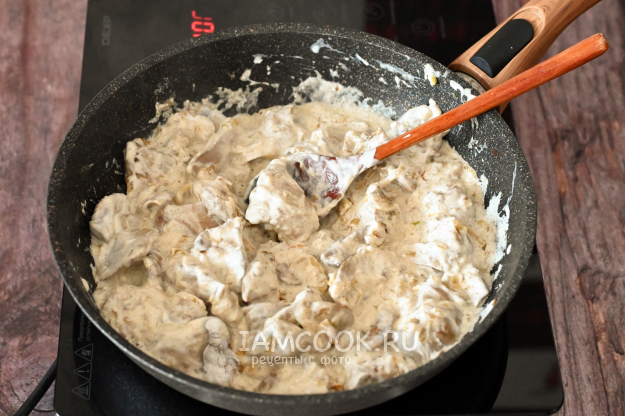 Добавьте в сковороду к печени сметану. Жирность выбирайте на свой вкус. Мне кажется, сметана 15-20% жирности - то, что надо.