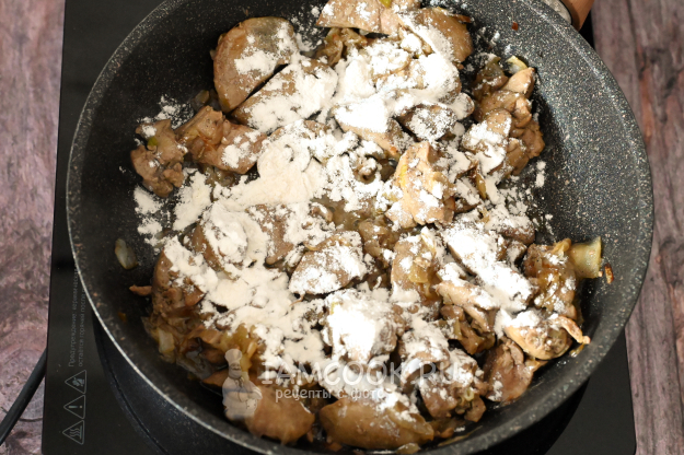 Посыпьте печень мукой и перемешайте.