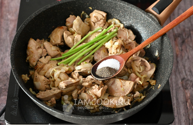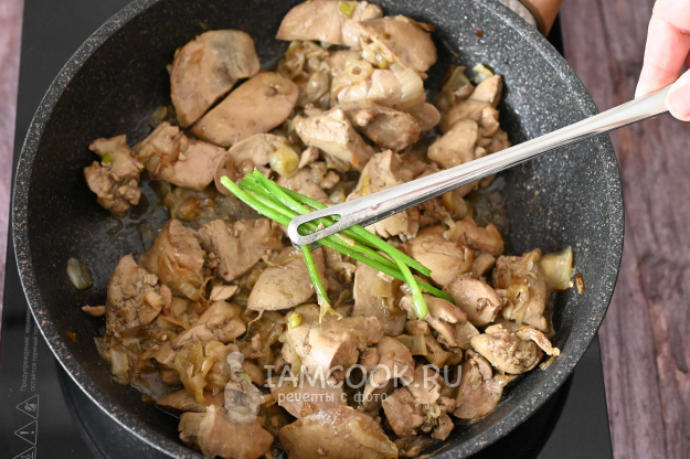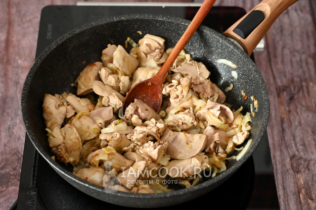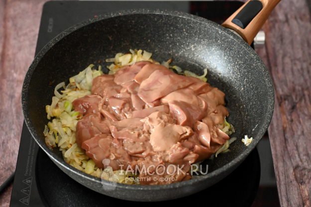 К обжаренному луку добавьте нарезанную утиную печень и чуть прибавьте нагрев плиты.