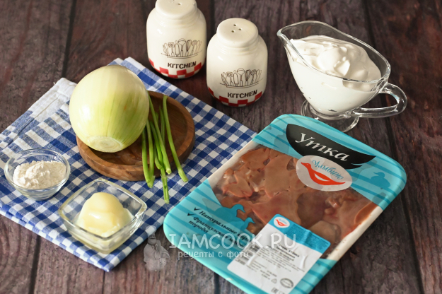 Вот тот набор продуктов, который потребуется для приготовления утиной печени в сметане с луком.
