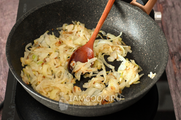 Разогрейте в сковороде утиный жир и обжарьте в нём нарезанный лук до лёгкого золотистого цвета (примерно 7-8 минут). Огонь средний или чуть выше среднего. Лучок не должен тушиться, нам нужен вкус именно хорошо поджаренного лука.