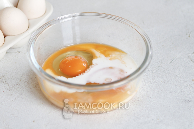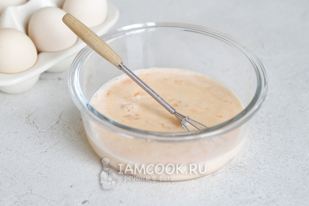 Влейте молоко, добавьте щепотку соли и слегка взбейте яйца с молоком.