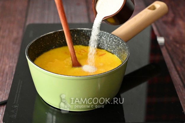 Не дожидаясь закипания, всыпьте в молоко манку тонкой струйкой и постоянно помешивайте, чтобы не было комков.