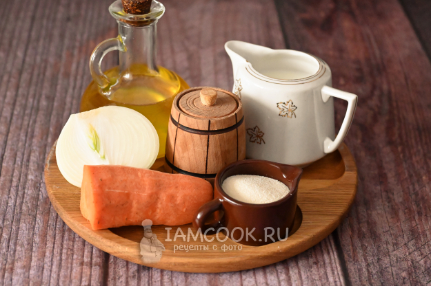 Соберите необходимые продукты для приготовления манки с морковью и луком.