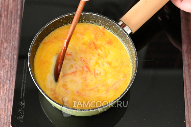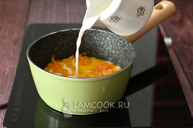 К пассерованным овощам влейте молоко.