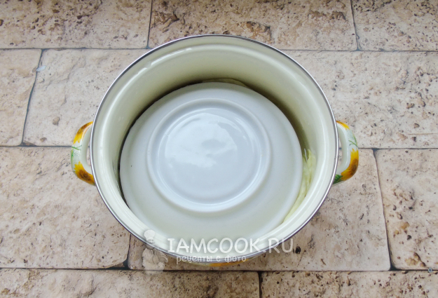 Чтобы капуста в рассоле не всплывала, накройте её тарелкой и поставьте груз. Квасьте капусту при комнатной температуре 5-7 дней. В первые 2-3 дня идет активное брожение. На поверхности рассола появятся пузырьки газа. После брожение замедляется, рассол становится мутнее и появляется характерный кисловатый запах.
