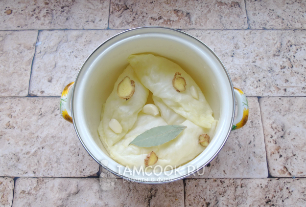 Квасить капусту лучше всего в стеклянной или эмалированной посуде. На дно кастрюли выложите в два ряда капустные листья. Сверху разложите зубчики чеснока, нарезанный имбирь, перец черный горошком и лавровый лист.