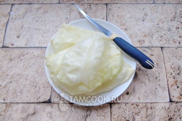 С кочана капусты снимите верхние листья и аккуратно вырежьте кочерыжку.