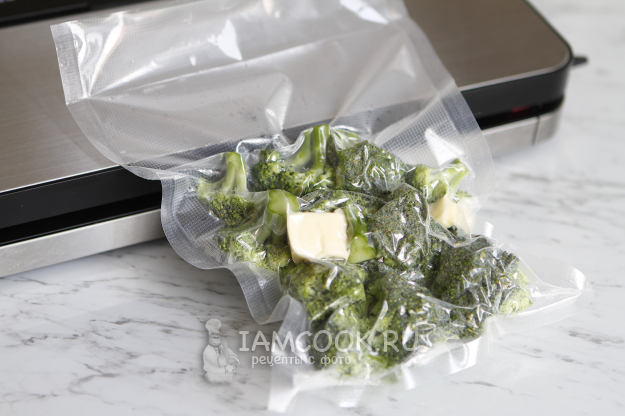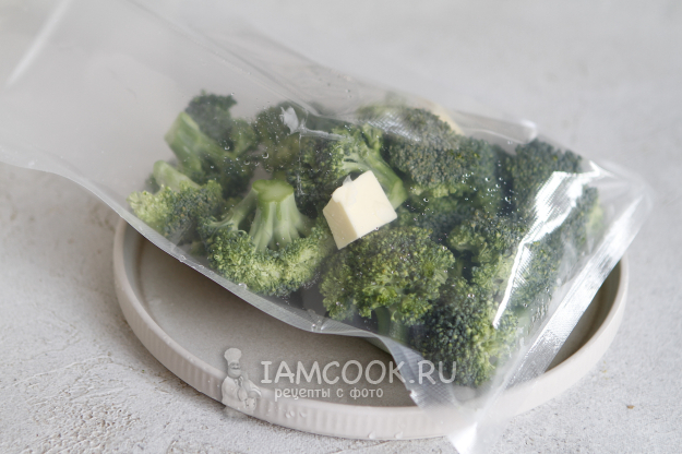 Сложите соцветия брокколи в пакет для вакуумации и добавьте кусочек сливочного масла.