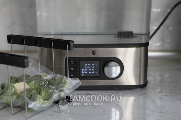 Когда вода нагреется до нужной температуры, опустите пакет с брокколи и готовьте 25 минут. Если готовить брокколи при более высокой температуре и дольше по времени, результат может разочаровать. У капусты появится неприятный серный запах.