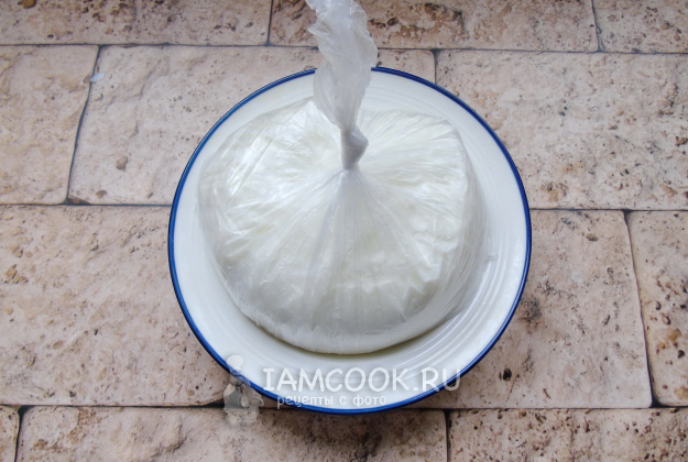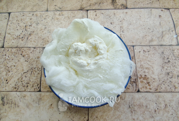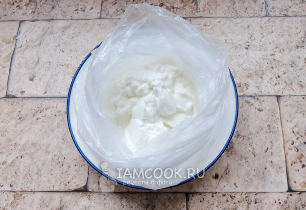 После достаньте его из морозилки. Обрежьте пакет и освободите замерзший йогурт. Дуршлаг поставьте на глубокую миску или кастрюлю. Постелите в него марлю, сложенную в несколько слоев, и выложите йогурт. В процессе размораживания будет формироваться творожная масса и уплотняться, а в миску будет стекать сыворотка. Когда йогурт уже хорошо разморозится, можно накрыть его марлей и поставить груз. Или вместе с марлей подвесить над емкостью, чтобы сыворотка лучше стекала.