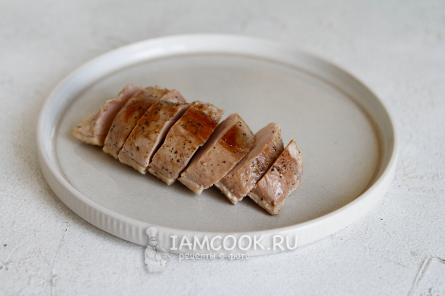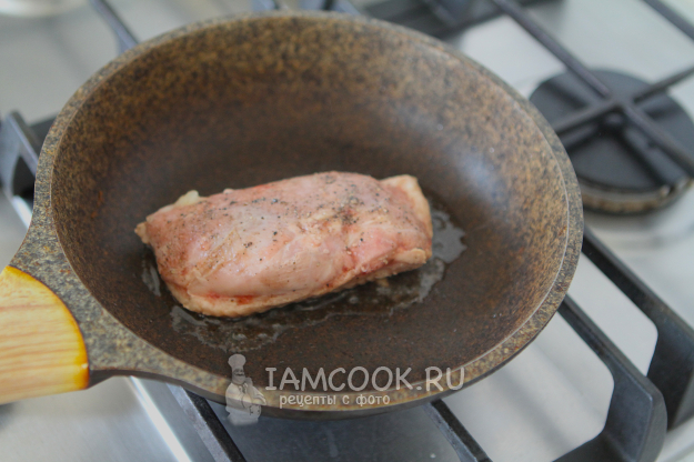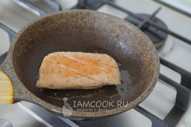 На сухой сковороде обжарила грудку на сильном огне без масла, начиная со стороны, где кожа.