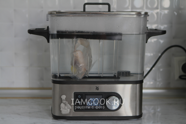 Я готовила утиную грудку 3 часа при температуре 58 градусов. Нагрейте воду до нужной температуры. Когда вода нагреется, опустите пакет с утиной грудкой и выставьте нужное вам время.