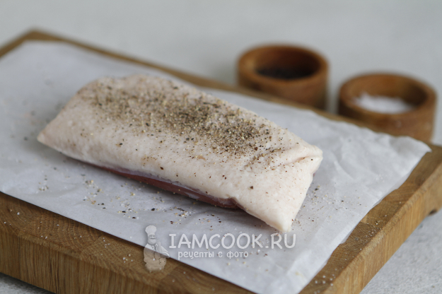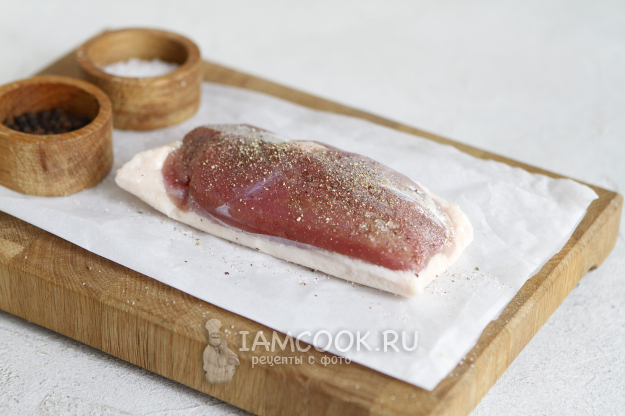 Специи я взяла базовые: черный молотый перец и соль. Вы же можете добавить ваши любимые специи для утки. С двух сторон присыпьте грудку солью.