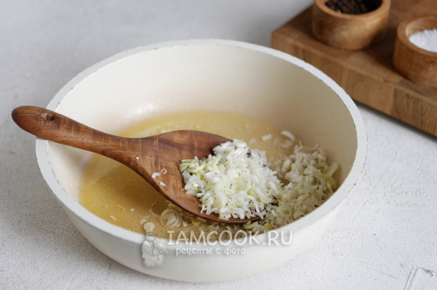 Разогрейте сковороду с кусочком сливочного масла и влейте оливковое масло. Прогрейте чеснок.