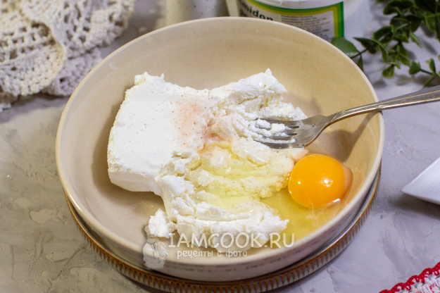 В подходящую емкость выложите творог, добавьте одно среднее (55 граммов) яйцо и соль. Разотрите массу вилкой. Обратите внимание, что творог нужен сухой, пастообразный, без лишней сыворотки и крупинок. У меня обычный творог в брикетах 5% жирности.