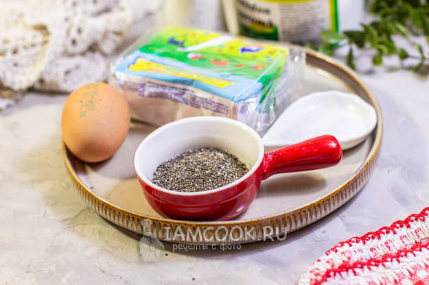 Соберите необходимые продукты для приготовления ленивых вареников с семенами чиа. Нам понадобится сухой, брикетный творог с жирностью от 2 до 9%, одно куриное яйцо и семена чиа. По желанию в творожную массу можно добавить подсластитель и ванилин.