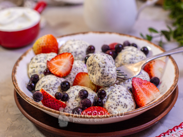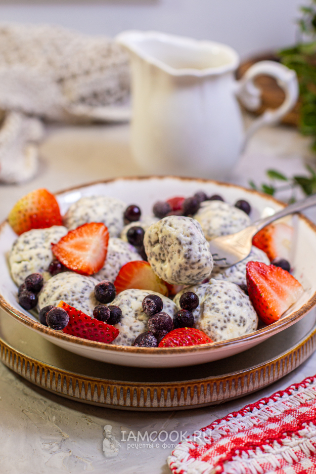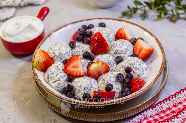Подавайте ленивые вареники с семенами чиа с ягодами, греческим йогуртом или сметаной.