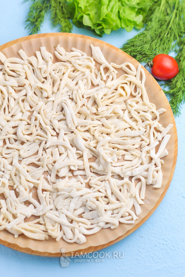 Обпылите его мукой и соедините края, затем еще раз и еще раз. Нарежьте лапшу и выложите на тарелку, доску.