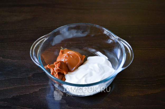 Для крема положите в миску сгущенное молоко и сметану. Если хотите - добавьте сахар. Мне было достаточно сладости сгущенного молока.