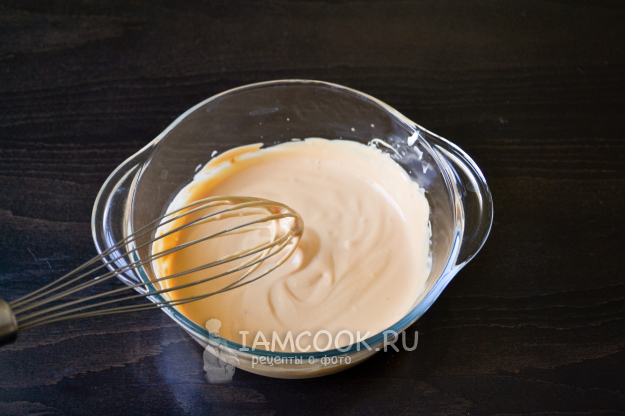 Ручным венчиком взбейте сметану со сгущенным молоком до однородной консистенции. Можно перемешать вилкой/ложкой.