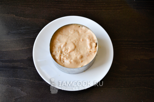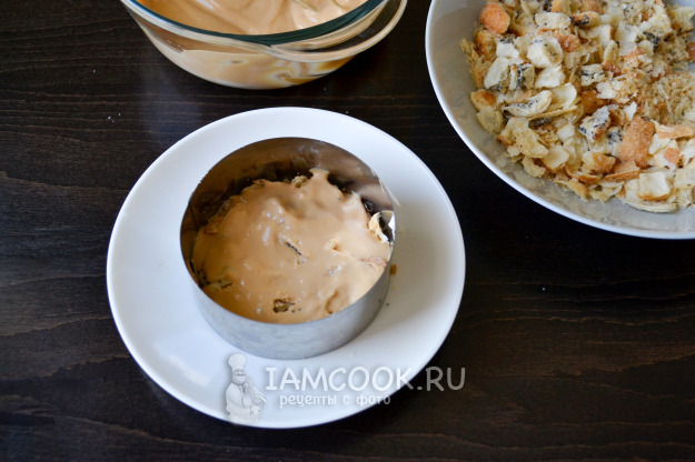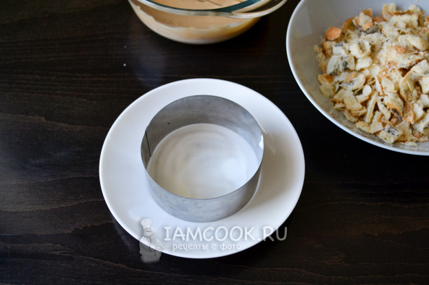 Пирожное можно приготовить двумя способами. Для первого способа я использую кулинарное кольцо. Кольцо поставьте на плоскую тарелку. Смажьте сметаной.