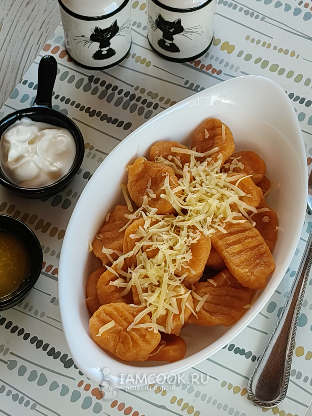 Ньокки из батата я подала с маслом и сметаной, посыпав сыром.
