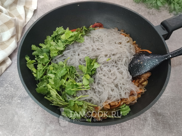 Соедините мясо, лапшу, по желанию добавьте зелень. Я добавляю кинзу, не жалея, граммов 30.