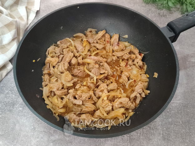 Выложите лук, обжарьте еще минутку, постоянно помешивая.
