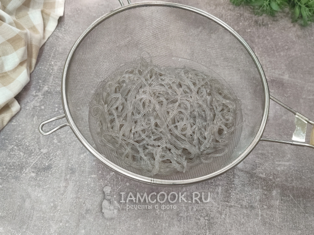 Лапшу приготовьте согласно инструкции на упаковке, я отварила лапшу около 7 минут, откинула на сито и промыла холодной водой.