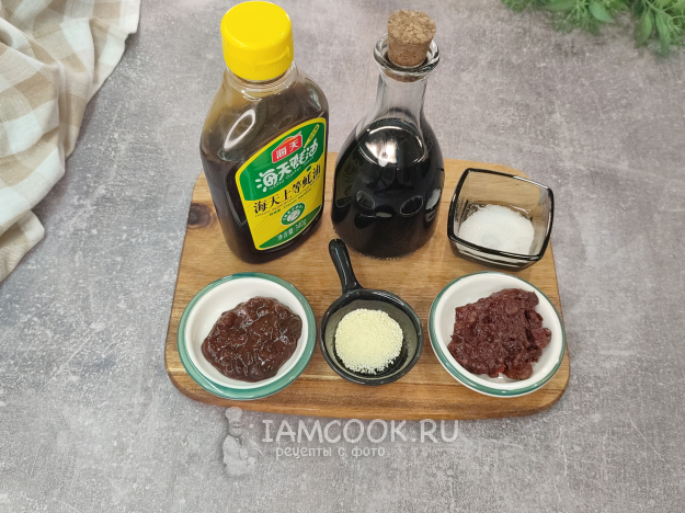 Помимо базовых китайских соусов (соевый, устричный, куриный порошок), я взяла сегодня еще простую соевую пасту (можно взять корейскую твенджан) и острую пасту тобадзян.