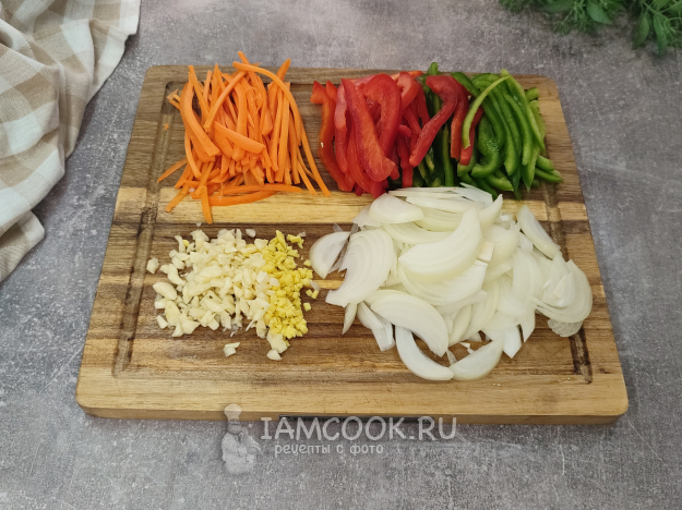 Блюдо готовится быстро, поэтому сначала все подготовим, нарежем. Раз уж я сегодня использую лапшу, то и овощи нарежу соломкой. Чеснок и имбирь измельчаем.