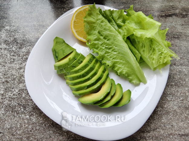 Сверху положить салатные листья и авокадо.