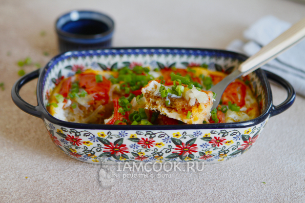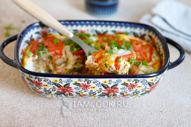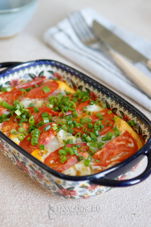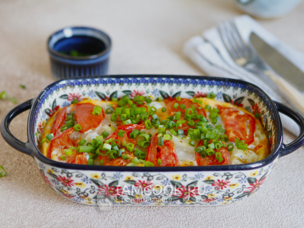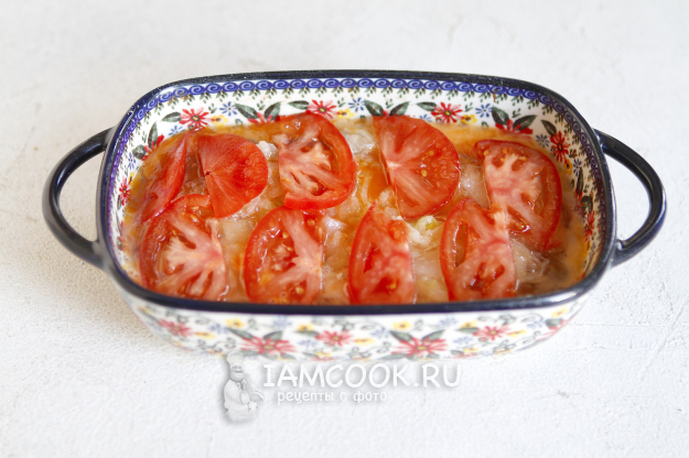 Помидор нарежьте на слайсы, как в моем случае. Если у вас помидоры черри, то просто разрежьте их пополам и выложите в форму.