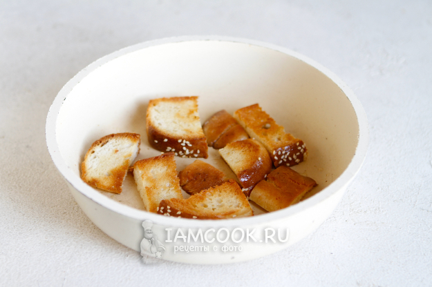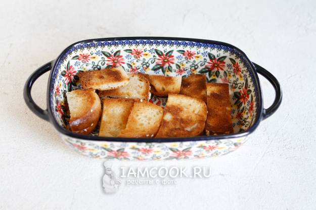 Подготовьте подходящую форму для запекания. Уложите в нее кусочки жареного хлеба.