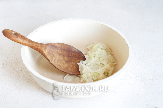 Готовые кусочки хлеба снимите со сковороды, добавьте оставшееся масло и обжарьте на нем репчатый лук до мягкости.