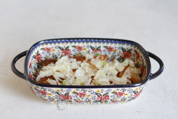 Сверху, на кусочки хлеба, выложите жареный лук.