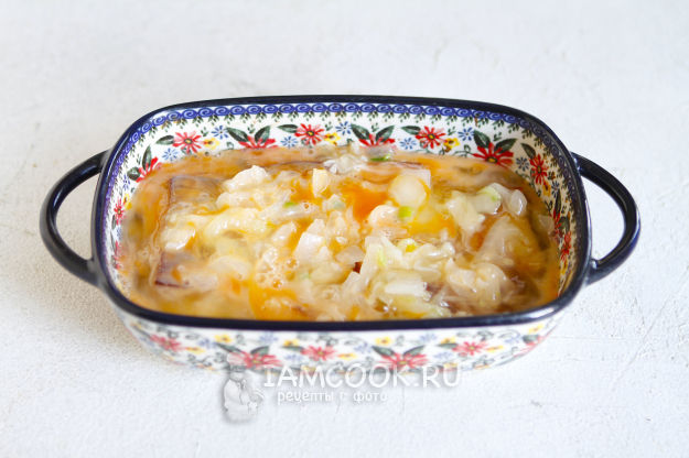 В отдельной чаше взбейте 3-4 яйца и слегка посолите. Яичную смесь влейте в форму.