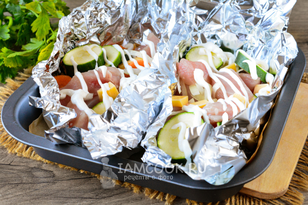 Все ингредиенты полейте небольшим количеством майонеза (или другим белым соусом), отправьте всё запекаться в разогретую духовку. Концы фольги можете слегка прикрыть, а в конце запекания - развернуть.