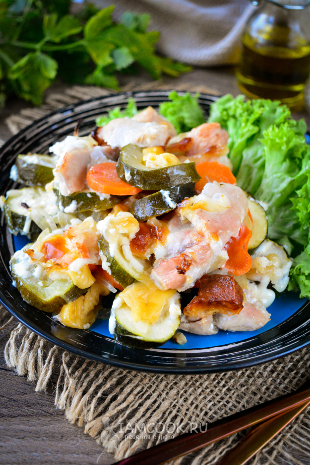 Запекайте курицу в духовке с овощами и сыром примерно 25-30 минут при 180-190°С.