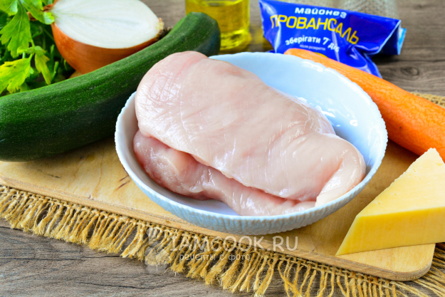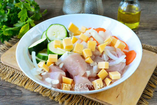 Соберите необходимые продукты для приготовления аппетитной курицы в духовке с овощами и сыром.