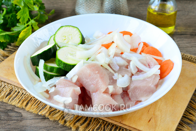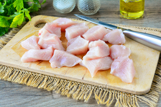 Куриное мясо сполосните, нарежьте средними кусочками или кубиками. Для такого рецепта идеально подходит филе, если не хотите возиться с костями и кожицей.